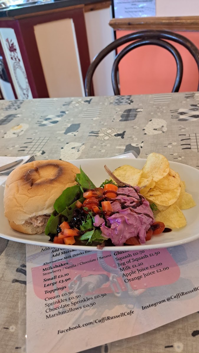 Caffi RUSSELL'S is renowned for its diverse menu that caters to both light lunches and hearty snacks. Whether you’re in the mood for a freshly made sandwich, a slice of delicious cake, or perhaps a satisfying Welsh Rarebit, you'll find it all here. The cafe’s offerings include an array of enticing options such as sandwiches, burgers, pizza, homemade soups, and delightful sweet treats. Real standout dishes include the popular tuna sandwich, complemented by a flavourful side salad drizzled in a lovely balsamic dressing, and the homemade Welsh Rarebit, served with your choice of sides that perfectly balance taste and satisfaction.